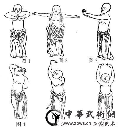 古代相传的易筋经姿式及锻炼法有12势,即韦驮献杵(有3势)、摘星换斗、三盘落地、出爪亮翅、倒拽九牛尾、九鬼拔马刀、青龙探爪、卧虎扑食、打躬势、工尾势等。