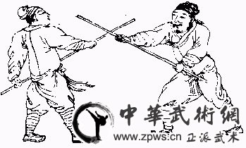 ●两人大门齐对打,我且将棍提在高(连脚抽回些),迟斯须进步压打下,即进变扁身中拦。若我打去,他棍提回让我,我须勿将棍尾打下,只进步对他胸喉,直杀去。?